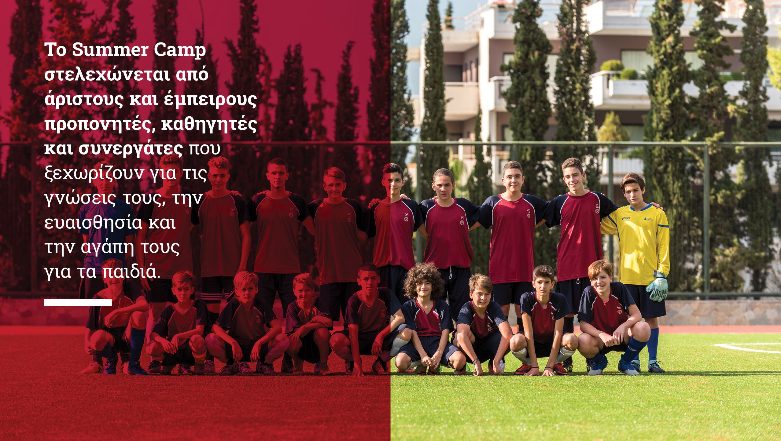 Το Summer Camp πραγματοποιείται μετά τη λήξη του σχολικού έτους και είναι σχεδιασμένο ώστε να καλύπτει τις αθλητικές, καλλιτεχνικές και μαθησιακές αναζητήσεις παιδιών 6-14 ετών (στο Summer Camp γίνονται δεκτά παιδιά που το Σεπτέμβριο θα πάνε στην Α’ Δημοτικού και μεγαλύτερα), που επιθυμούν να περάσουν δημιουργικά τις ημέρες του καλοκαιριού μετά τη λήξη του σχολικού έτους. Τα τμήματα χωρίζονται βάσει ηλικίας ή εμπειρίας. Το πρόγραμμα είναι πρωτίστως στην Ελληνική γλώσσα, αλλά η χρήση της Αγγλικής γλώσσας χρησιμοποιείται παράλληλα από τους εκπαιδευτές.